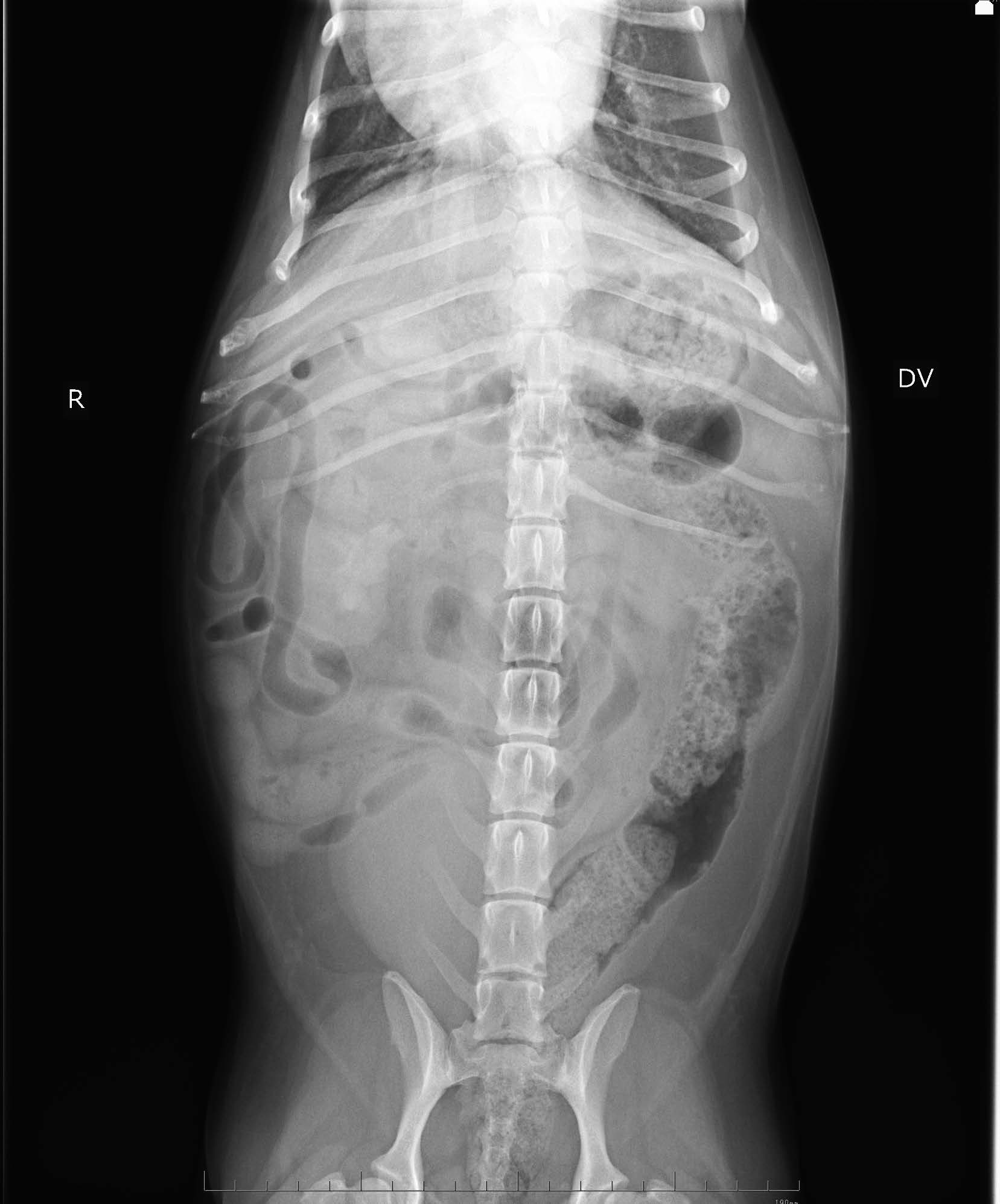 画像検査:腹部X 線検査では,肝サイズの低下と両腎にX 線不透過性の低い陰影が認められた(図1).腹部超音波検査では両側腎盂領域において,音響陰影を呈する高エコー構造物を認めた(図2).膀胱内には,高エコー源性の浮遊物及び沈渣が観察された.