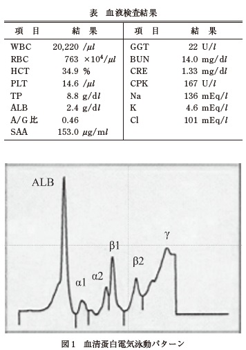 来院時検査所見:視診では右後肢の跛行(Grade3)があり,右飛節以下がやや腫脹していた.触診では腫脹部位の圧痛はあまりなく,飛節の熱感,屈曲痛,及び関節液の軽度増量がみられた.体温は38.1℃,安静時心拍数は52 回/ 分,安静時呼吸数は28 回/ 分であった.また,聴診では拡張期心雑音(Levine 分類3/6)が聴取された.身体検査ではその他に異常所見は認められなかった.臨床検査として,血液生化学検査(表),血清蛋白電気泳動検査(図1),飛節のX 線検査(図2),心エコー検査(図3,B モード及びカラードプラー)を行った.