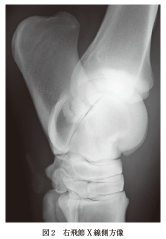 来院時,主訴は微熱と右後肢の軽度腫脹及び跛行ということで,局所に原因があることを疑い,検査を行った.全身性の発熱を伴う跛行としては,フレグモーネ,感染性の関節炎・滑膜炎・骨髄炎等が考えられるが,いずれも重度跛行を示し,触診痛が著しいのが一般的である.さらに,成馬で外傷がみられない場合,感染性の関節炎・滑膜炎・骨髄炎に罹患することはまれである.本症例では跛行はGrade3 であり,常歩では跛行を示さず,速歩を行うことで右後肢跛行が確認できる程度であった.また,右飛節の熱感,屈曲痛,関節液の軽度増量はあるものの,腫脹部位の圧痛は顕著ではなかったため,発熱の原因が跛行肢に起因しているかは判断できなかった.