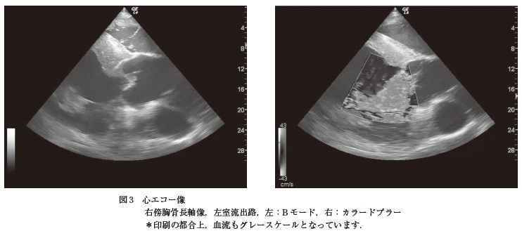 次に,来院前に何らかの感染症の存在を疑っていたが,来院時の血液検査では,表及び図1 に示すように重度感染症を疑う結果であった.前述のとおり,跛行肢の局所身体検査では重度感染症を疑う兆候が乏しかったため,改めて全身の身体検査を行ったところ,拡張期心雑音,頻脈,頻呼吸が認められ,感染性心内膜炎を疑う所見が得られた.このため,心エコー検査(図2)を行った.心エコーB モードでは大動脈弁の弁尖が肥大し歪な形状となっており,疣贅が形成されていた.さらに,同部位におけるカラードプラーでは大動脈弁を左心室に逆流するジェット血流がみられ,そのジェット血流は心室自由壁に達していた.これらの所見から,感染性心内膜炎と診断した.