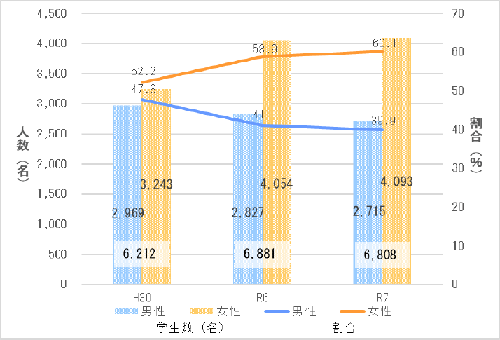 図2.獣医学部生数及び割合の推移(平成30 年度及び令和6、7年度)