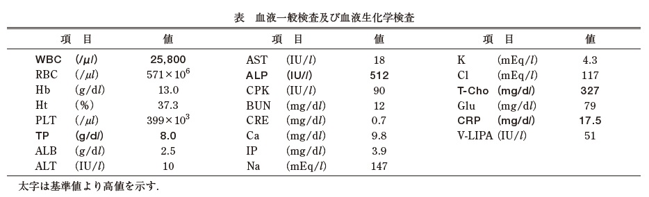 血液検査・血液生化学検査:CRP 及びWBCの高値を認めた.また,TP,ALP 及びT-Cho も高値であった.