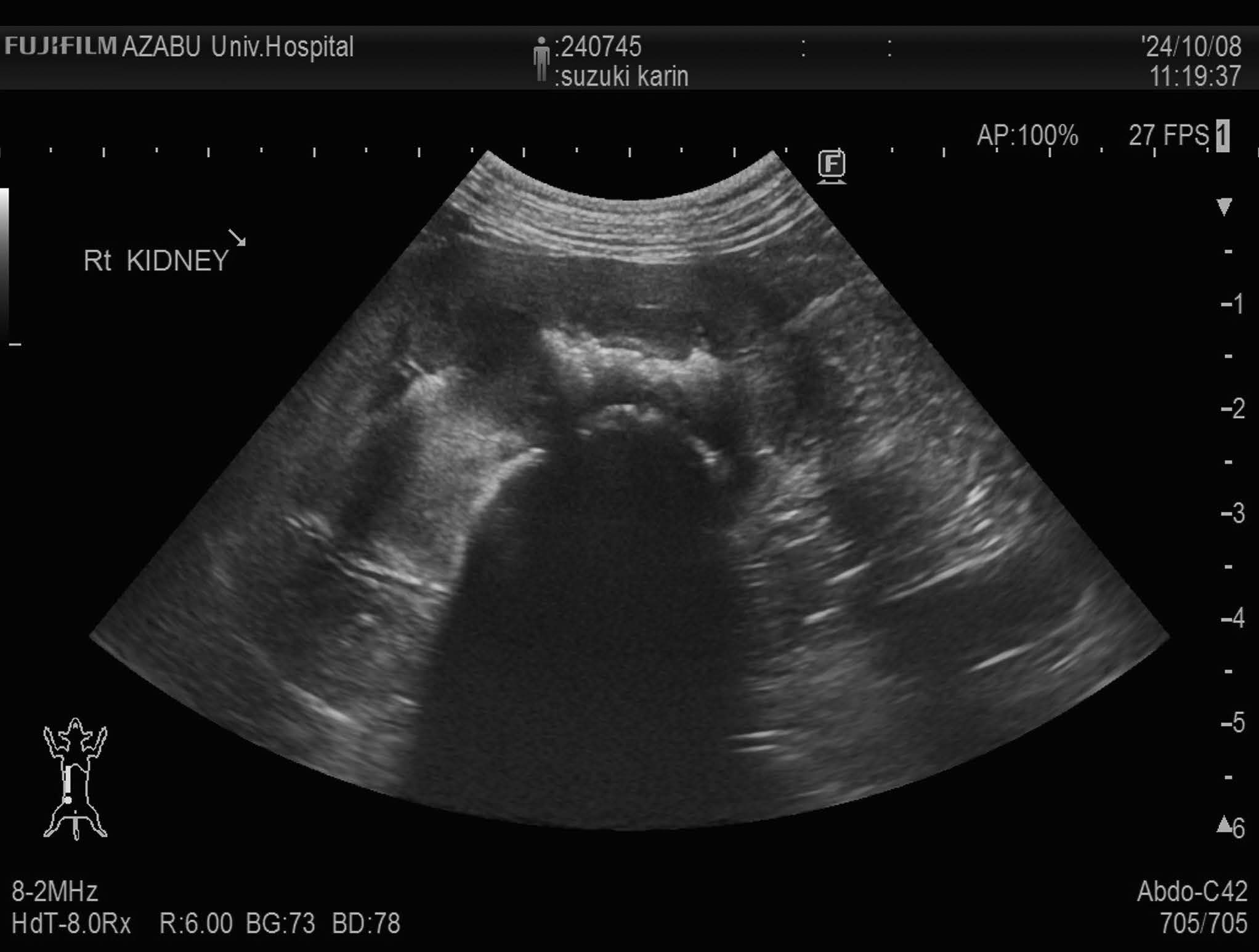 画像検査:腹部X 線検査では,肝サイズの低下と両腎にX 線不透過性の低い陰影が認められた(図1).腹部超音波検査では両側腎盂領域において,音響陰影を呈する高エコー構造物を認めた(図2).膀胱内には,高エコー源性の浮遊物及び沈渣が観察された.