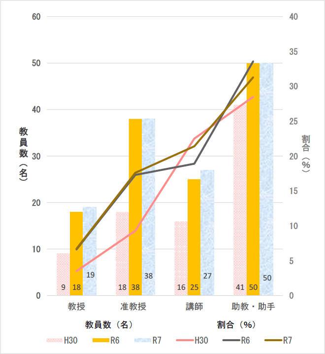 図1.女性獣医師教員数及び割合の推移(平成30年度及び令和6、7年度)